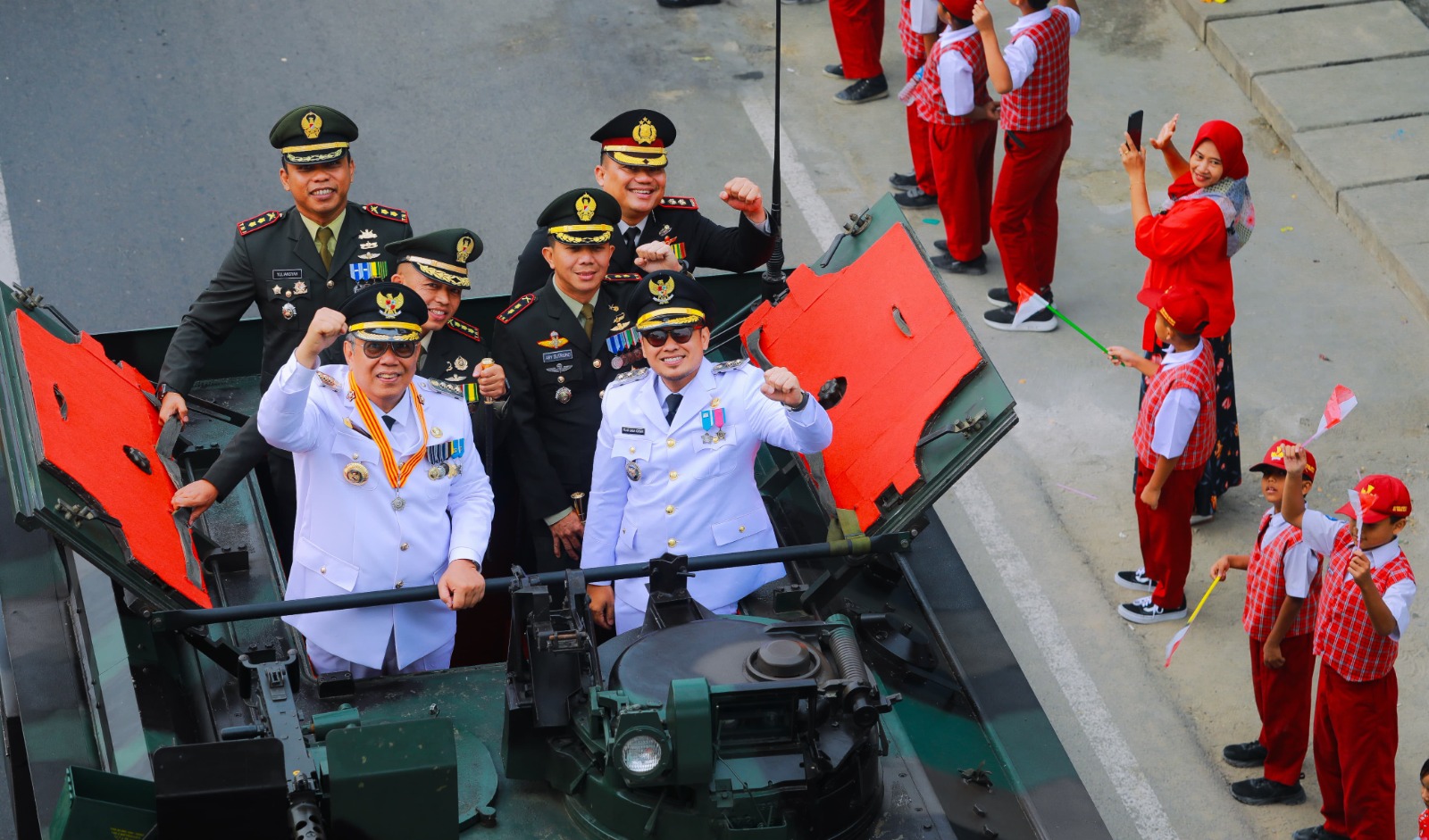 Menuju Lokasi Upacara Peringatan HUT RI Ke-79, Kapolres Tangsel Bersama Forkopimda Naiki Ranpur