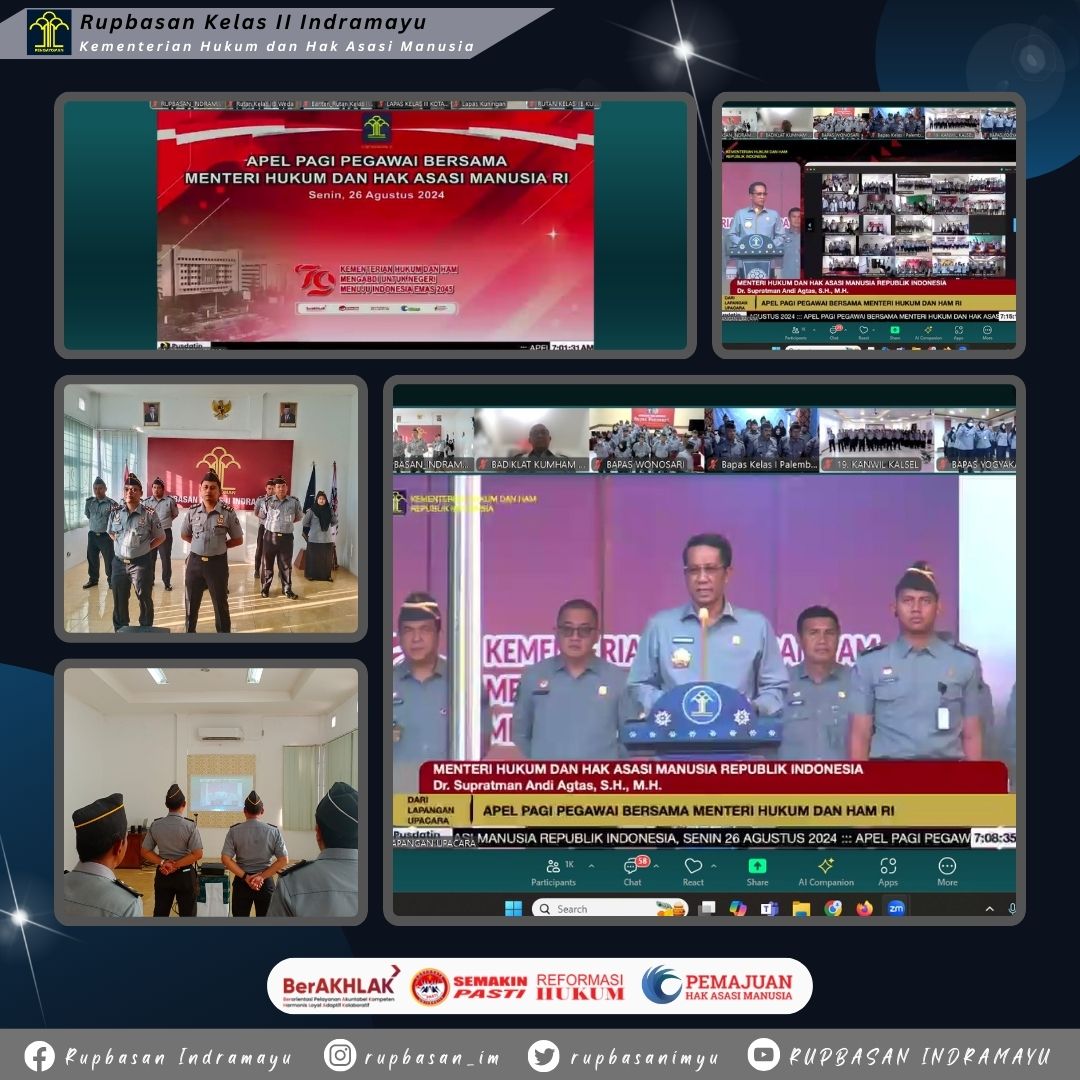Pelaksanaan apel pagi ini berlangsung terpusat di Lapangan Upacara Kementerian Hukum dan HAM RI dan diikuti oleh seluruh pegawai Kementerian Hukum dan HAM di seluruh Indonesia secara virtual.