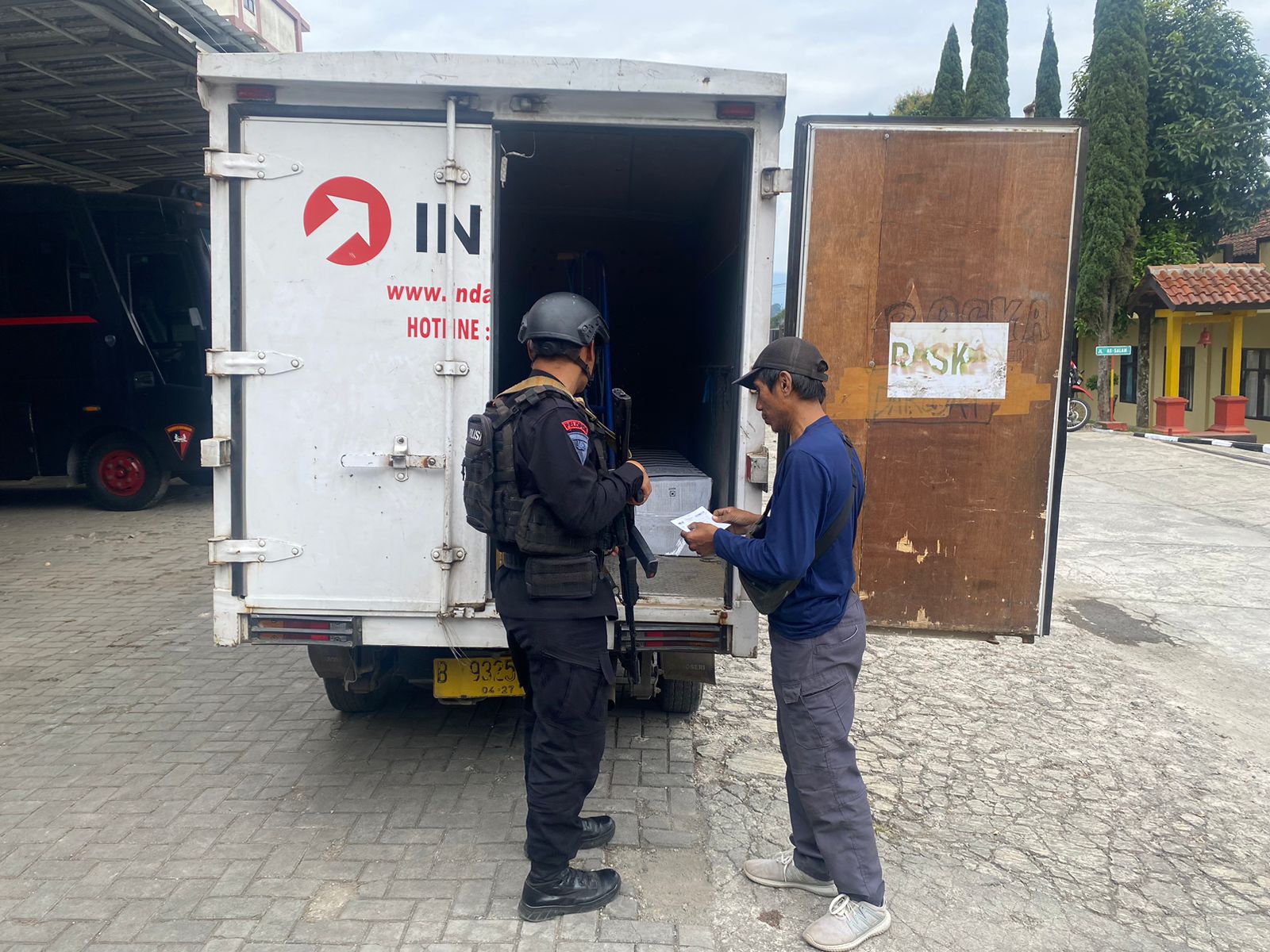 Lembang, kicaunews.com – Anggota jaga mako kompi 2 Batalyon B Pelopor Dpp Aiptu Ali yang di siagaakan di pos penjagaan depan memeriksa kendaraan Box yang masuk, bertujuan mencegah adanya muatan terlarang yang dibawa oleh suatu kendaraan box atau kendaraan lain nya .