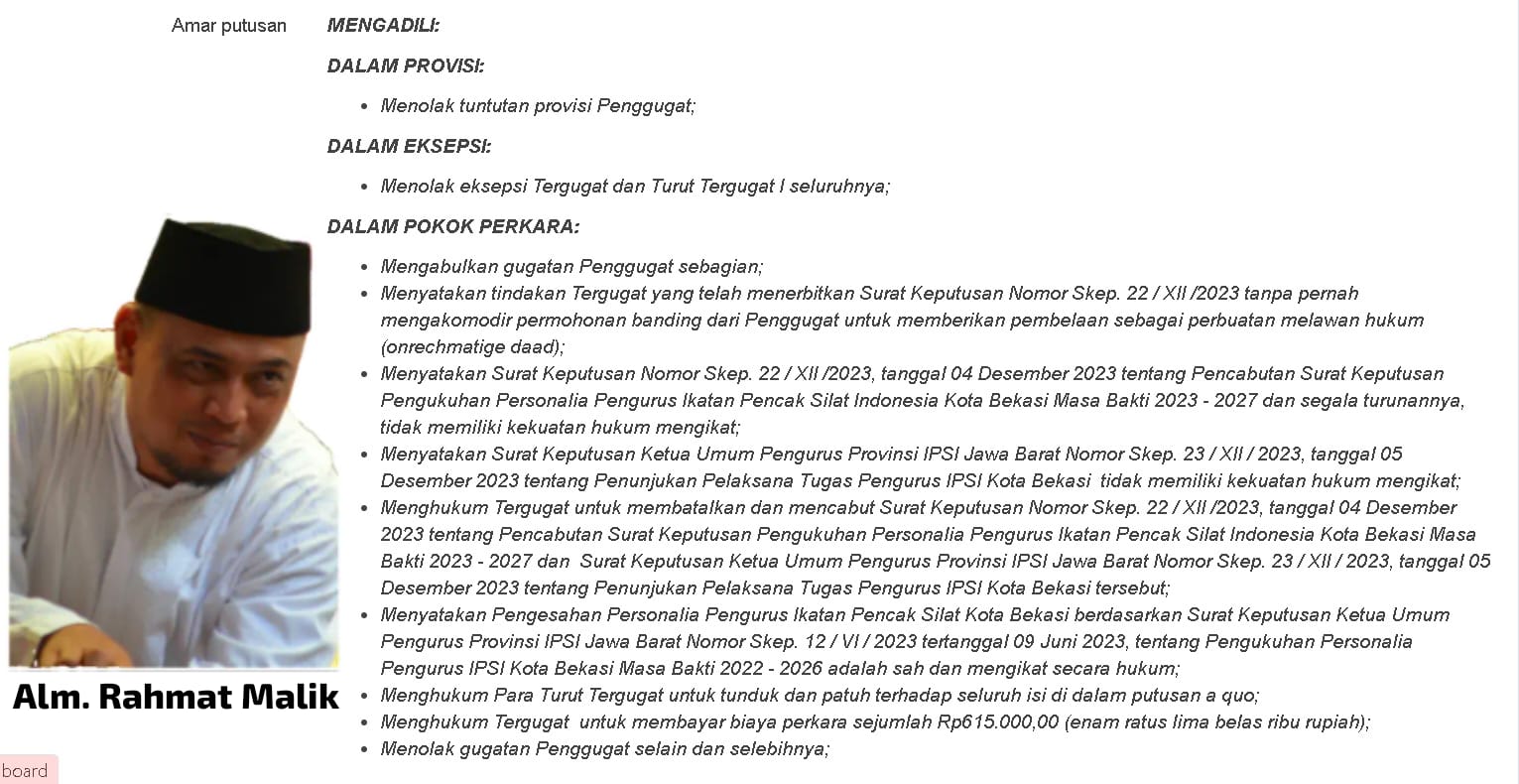 Selain itu hakim PN Bandung menyatakan SK Nomor Skep 22/XII/2023 tanggal 4 Desember 2023 tentang pencabutan SK pengukuhan pengurus personalia IPSI Kota Bekasi periode 2023-2027 dan segala turunannya, tidak memiliki kekuatan hukum mengikat.