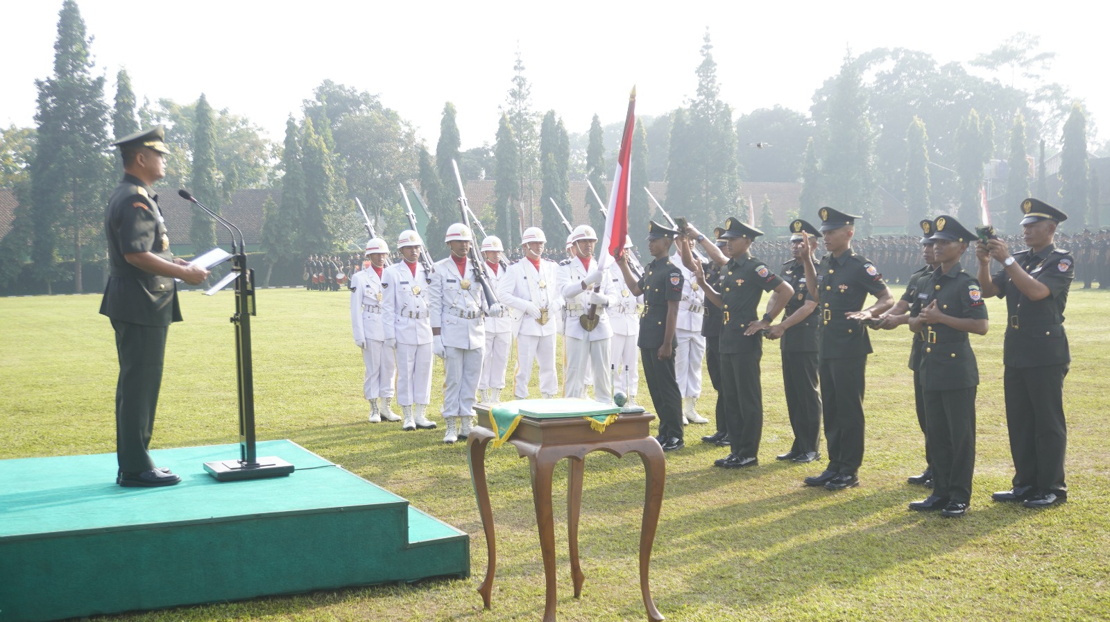 “Pendidikan yang telah kalian tempuh bukanlah akhir dari perjuangan, melainkan awal dari pengabdian sebagai prajurit TNI AD. Tugas ke depan akan semakin kompleks, sehingga kalian harus terus mengembangkan diri, menjaga integritas, menjunjung etika prajurit, dan tetap loyal kepada bangsa dan negara,” kutip Wakasad.