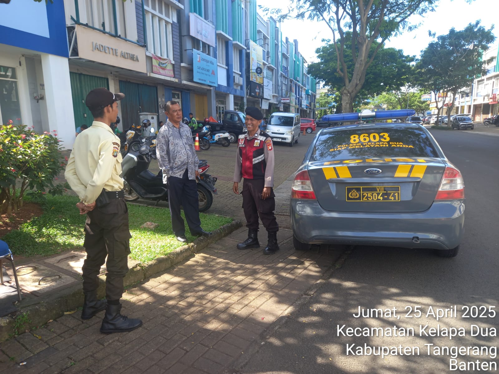 Patroli kali ini menyasar kawasan Ruko Neo Arcade, Gading Serpong, Kecamatan Kelapa Dua. Para petugas menyambangi sejumlah pemilik dan penjaga ruko untuk menjalin komunikasi serta meningkatkan kewaspadaan masyarakat terhadap potensi gangguan kamtibmas.