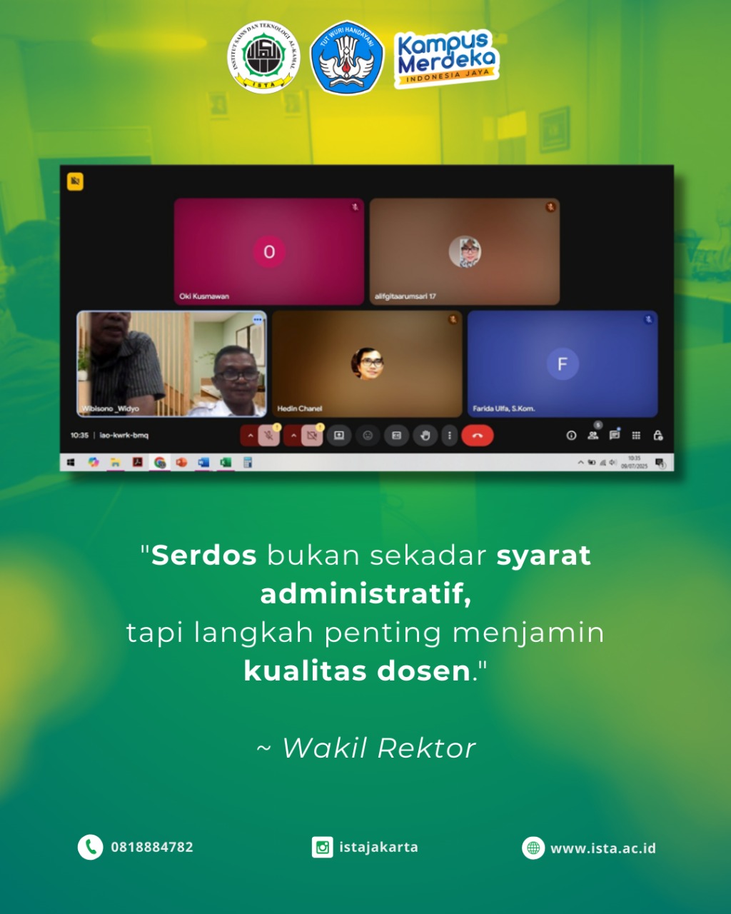 Acara dilaksanakan pada Rabu, 9 Juli 2025, pukul 10.00–12.00 WIB, secara luring (offline) di Ruang Rapat Lantai 3 Kampus ISTA, serta secara daring (online) melalui platform virtual meeting, guna memberikan akses seluasnya bagi seluruh dosen ISTA dari berbagai lokasi.