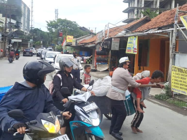 Dengan sigap, Iptu Evy membantu mendorong gerobak agar tidak mengganggu arus kendaraan yang melintas, sekaligus memastikan keselamatan warga tersebut saat menyeberang.
