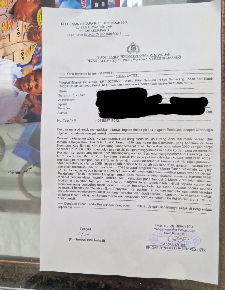 KAB. SEMARANG, Kicaunews.com – Sengketa kepemilikan sebidang tanah di Desa Ngempon, Kecamatan Bergas, Kabupaten Semarang, berujung pada pengaduan dugaan tindak pidana penipuan ke Polres Semarang, Kamis (29/1/2026). Sengketa ini mencuat setelah tanah yang telah diperjualbelikan sejak 2009 kembali dipersoalkan oleh pihak penjual.