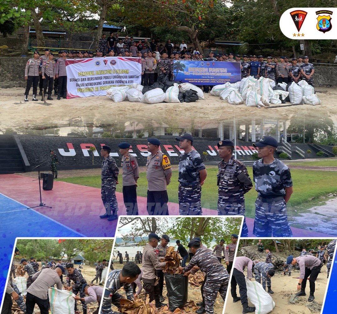 Nunukan, Kicaunews.com – Dalam rangka mendukung Program Gerakan Indonesia Asri Tahun 2026, personel Batalyon B Pelopor Satbrimob Polda Kalimantan Utara melaksanakan kegiatan sinergitas peduli lingkungan maritim pada Rabu, 11 Maret 2026 di kawasan Pantai Ecing, Kecamatan Nunukan Selatan, Kabupaten Nunukan. Kegiatan ini dipimpin langsung oleh IPTU Munir bersama 25 personel Batalyon B Pelopor yang turut berkolaborasi dengan berbagai unsur maritim dan masyarakat setempat.