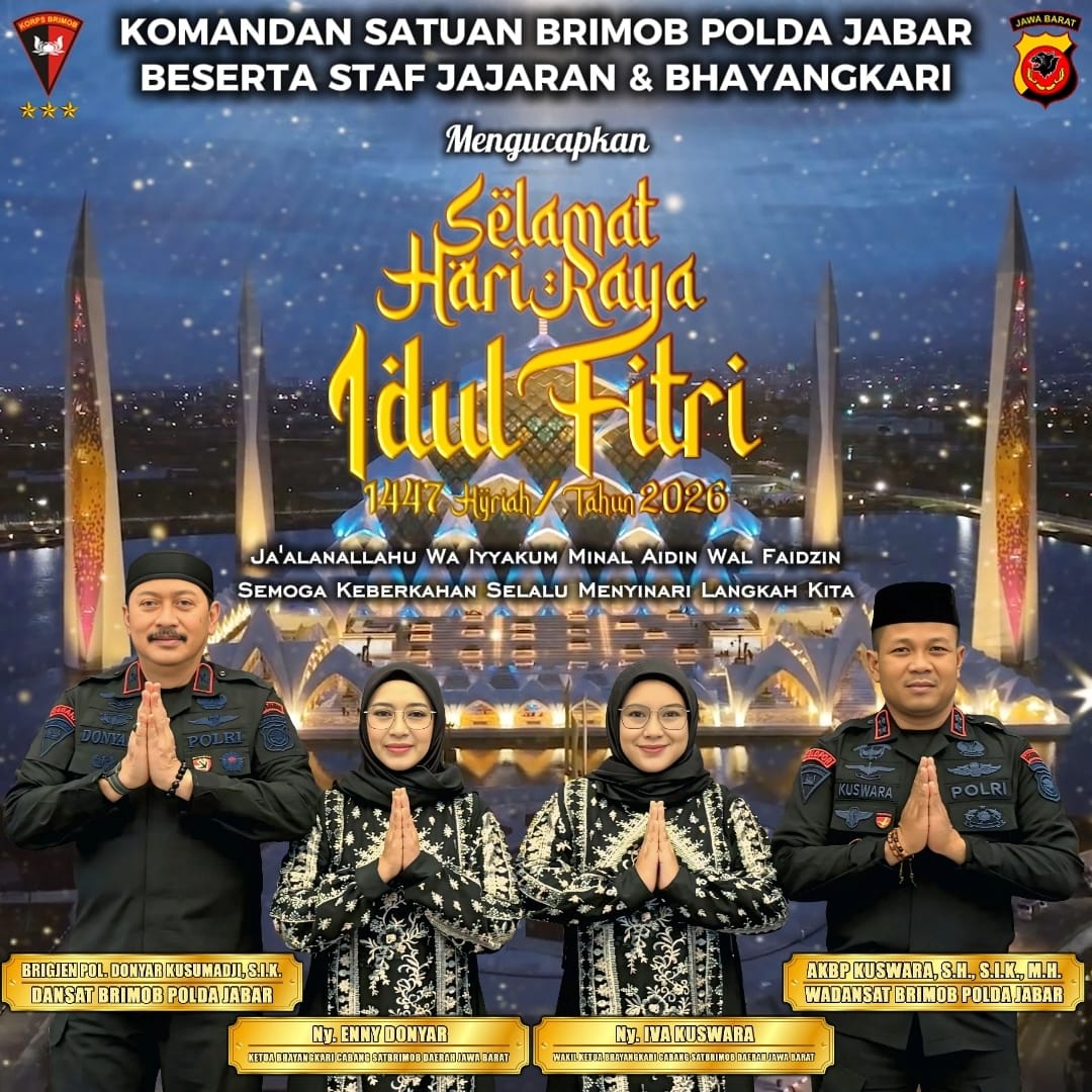 Sumedang,kicaunews.com – Dalam rangka menyambut Hari Raya Idul Fitri 1447 Hijriah, Komandan Satuan Brimob Polda Jawa Barat beserta jajaran staf dan Bhayangkari menyampaikan ucapan selamat kepada seluruh masyarakat, khususnya di wilayah Jawa Barat.