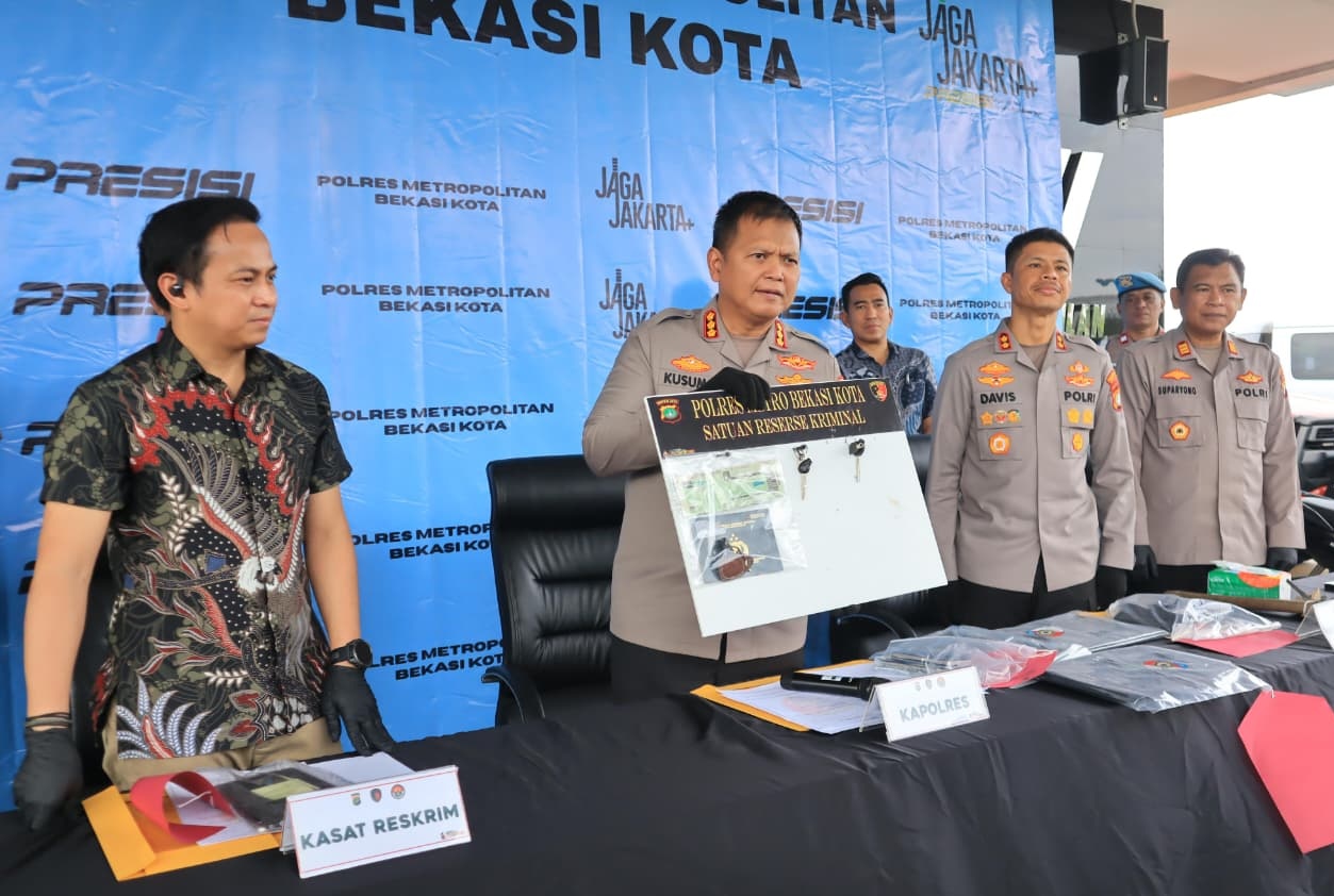 Bekasi, Kicaunews.com – Satuan Reserse Kriminal Polres Metro Bekasi Kota berhasil membongkar aksi premanisme bermodus penarikan motor paksa oleh oknum yang mengaku sebagai pihak leasing. Rilis pengungkapan kasus ini dipimpin langsung oleh Kapolres Kombes Pol Kusumo Wahyu Bintoro S.H S.I.K M.H, didampingi Wakapolres AKBP Davis Busin Siswara, Kasat Reskrim Kompol Dr. Andi Muhammad Iqbal dan Kasi Humas AKP Suparyono di Lobi Mapores Metro Bekasi Kota pada Jumat (27/3/2026).