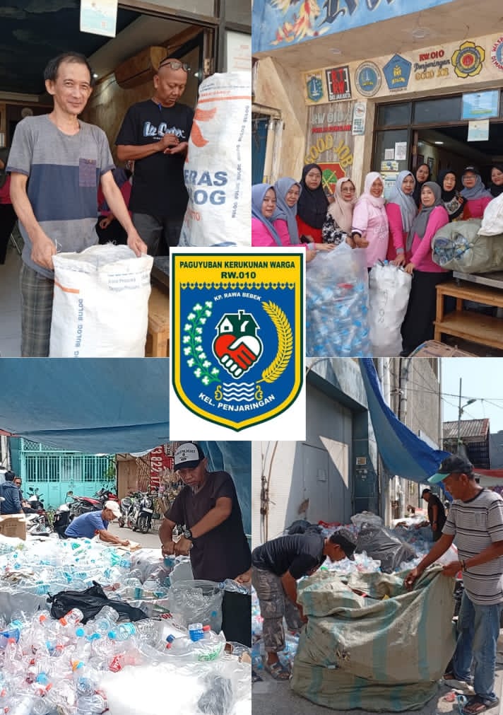 Seperti mineral dan kardus bekas serta minyak bumi/jelantah bekas memasak rumah tangga yang sulit terurai secara alami oleh bakteri, contohnya plastik, kaca, logam (kaleng, besi), karet, dan produk sintetis lainnya yang seringkali bisa didaur ulang menjadi produk baru dilakukan 1X dalam satu bulan berlokasi di Sekertariat Rw.010 Jl. Sukarela Kelurahan Kecamatan Penjaringan Jakarta Utara. Mengumpulkan hasil penimbangan warga yang dikerjakan oleh Ketua Rw.010 H. Rakib beserta Ketua PKW.010 Junaedi bersama Kantib 1 Komar Komeng Kantib 2 Kusnadi/Peang dibantu petugas linmas setelah di pilah bersama-sama lalu di jual ke pengepul barang barang bekas dan uang hasil penjualan disatukan dengan hasil sumbangan dari tiap bulannya dari para Ketua Rt yg peduli serta LMK juga ibu ibu PKK Dawis Jumantik Petugas Linmas yang di prakarsai Kantib Rw.010 juga tomas toga dan warga RW.010 minimal 50 ribu tiap bulannya.
