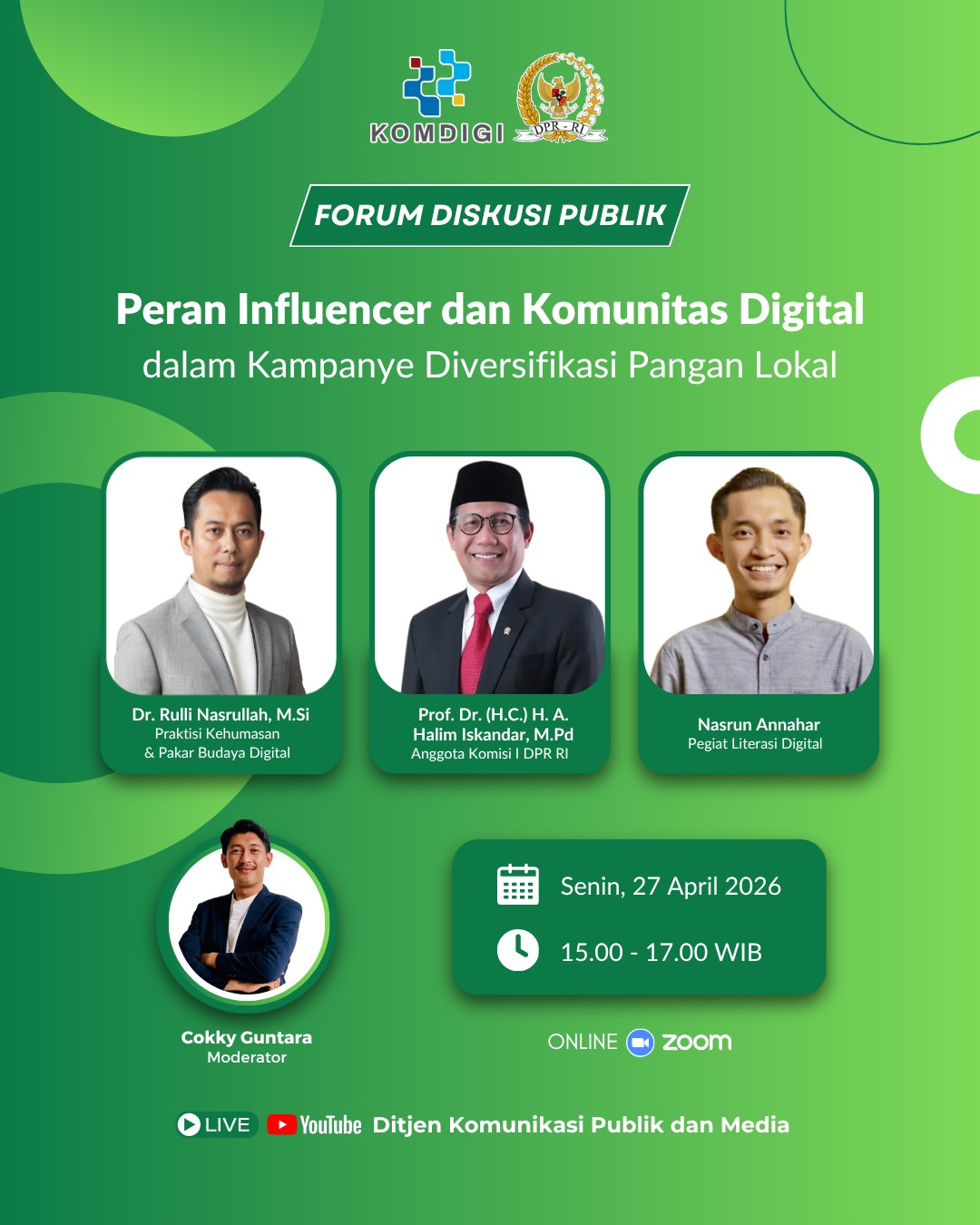 Kicaunews.com, Jakarta – Ditjen Komunikasi Publik dan Media (KPM) KEMKOMDIGI bersama Bapak Prof. Dr. (H.C.) H. A Halim Iskandar, M.Pd (Anggota Komisi I DPR RI) mengadakan webinar Forum Diskusi Publik dengan tema: ” Peran Influencer dan Komunitas Digital Dalam Kampanye Diversifikasi Pangan Lokal ” Pada hari Senin, 27 APRIL 2026, Pukul 15.00 – 17,00 WIB, Bertempat di Intel Studio Ps.Minggu, Komplex TNI AL, Jln. Teluk Peleng no. 32 B, Pasar Minggu, Jakarta Selatan.